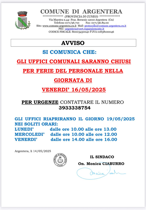 Variazione orari uffici comunali nella giornata del 12/12/2025
